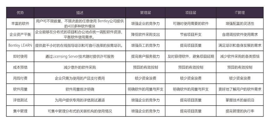 Bentley企業級(EPS-365)是幫助大中型企業或全球組織獲得運營和競爭優勢,每年減少軟件采購成本,同時增強軟件配置的靈活性,以單一年費租用系列軟件的計劃。提供以下權益: