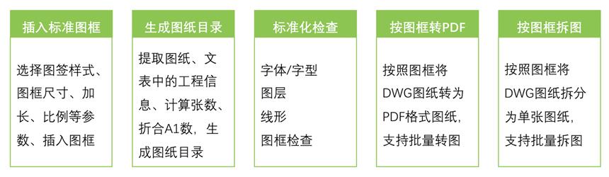 內置了一系列高效、智能輔助工具,協助設計人員輕松完成圖框快速插入、圖紙目錄自動生成、圖面標準化檢查、批轉PDF、批量拆圖等繁瑣任務。